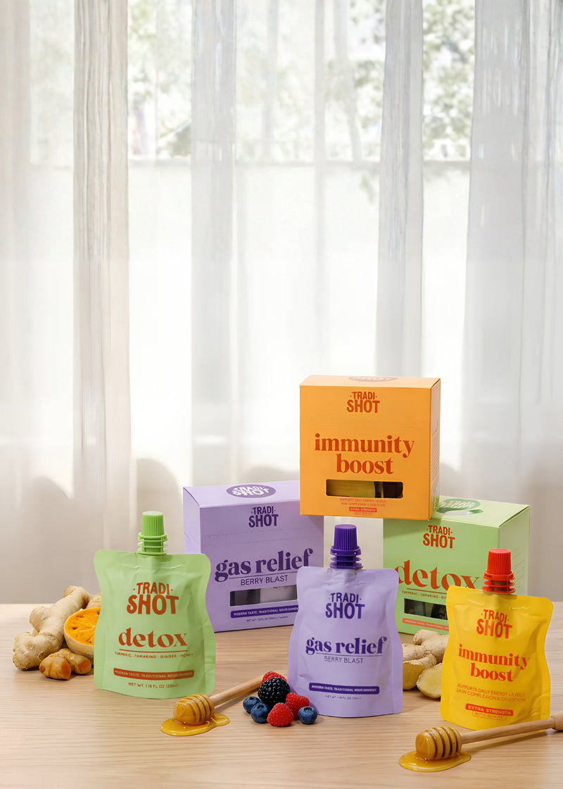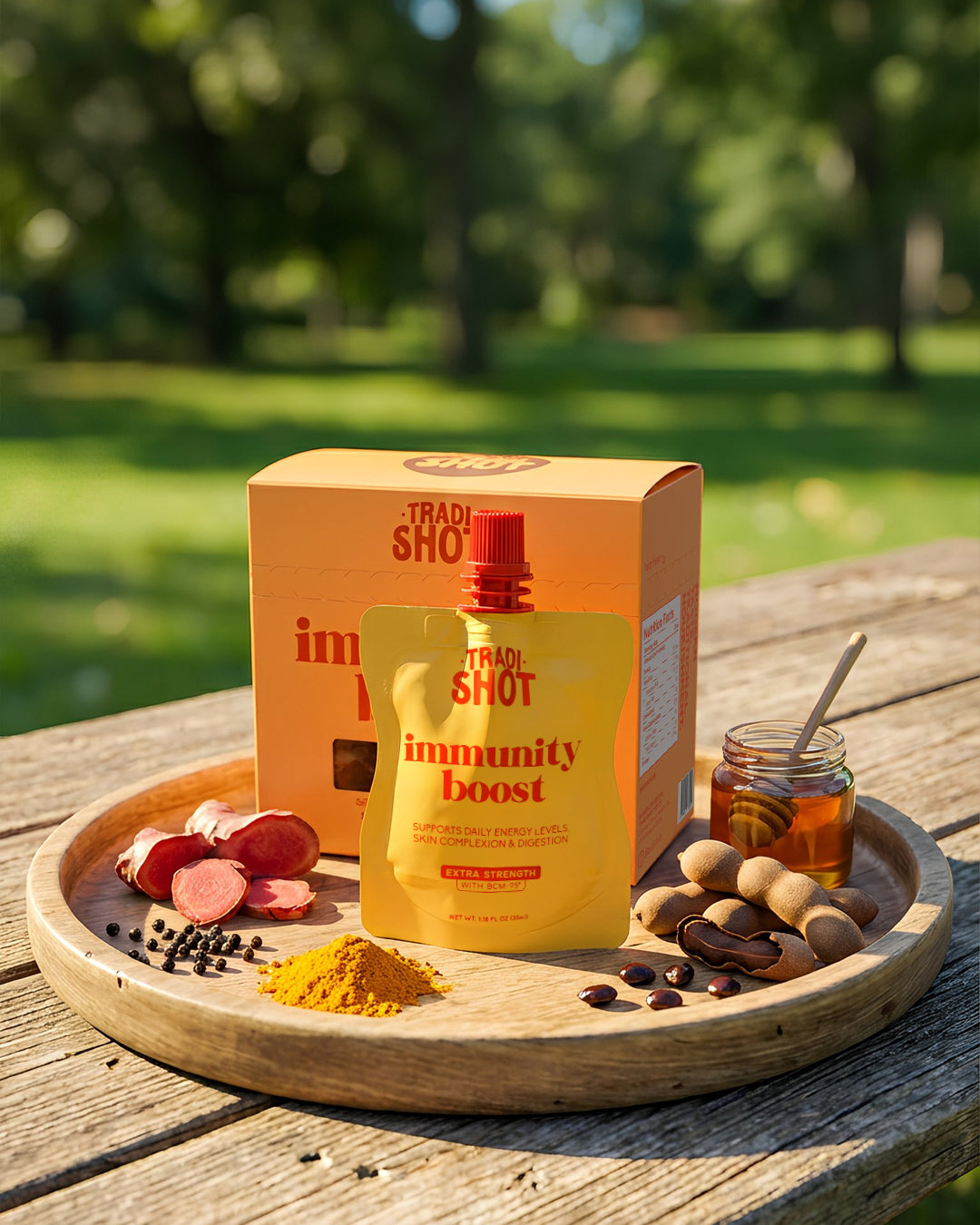 Tradishot Immunity Boost is a jamu-inspired herbal shot designed to support your body’s natural defenses, steady energy levels, and digestive balance. Convenient and ready to drink, it’s an easy daily ritual to help you feel refreshed and supported — anytime, anywhere.